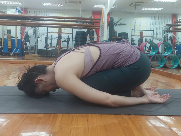 First let’s see if you can get into the pose if someone helps you. Try doing child’s pose. Place your arms beside your calves since we aren’t focusing on the shoulders for now. Check if you can keep your knees together and touch your knees to your chest and bum to your heels.