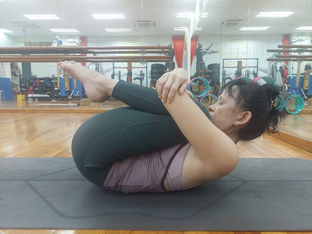 If your knees don’t touch your chest or bum doesn’t touch your heels, do you feel any tightness in your lower back? If you do, get someone to press on your lower back to deepen the stretch. It should feel good (and painless) as the ligaments and tendons are being stretched. A tight lower back is a common reason one cannot hug their knees to their chest.