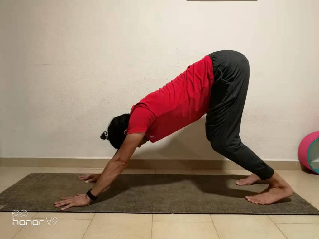 If your shoulders aren’t able to open all the way (you feel bone against bone, perhaps due to bone spurs or a curved/ hooked acromion), your downward dog variation would look like this, and that’s absolutely fine: