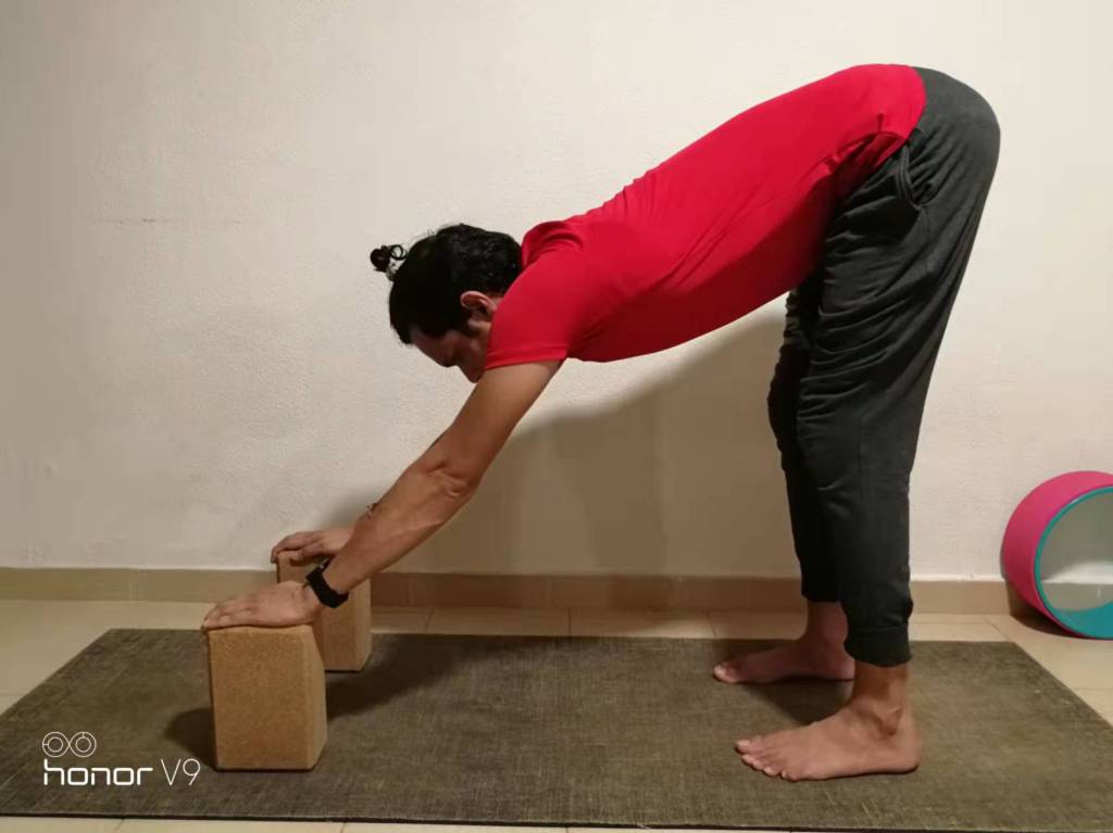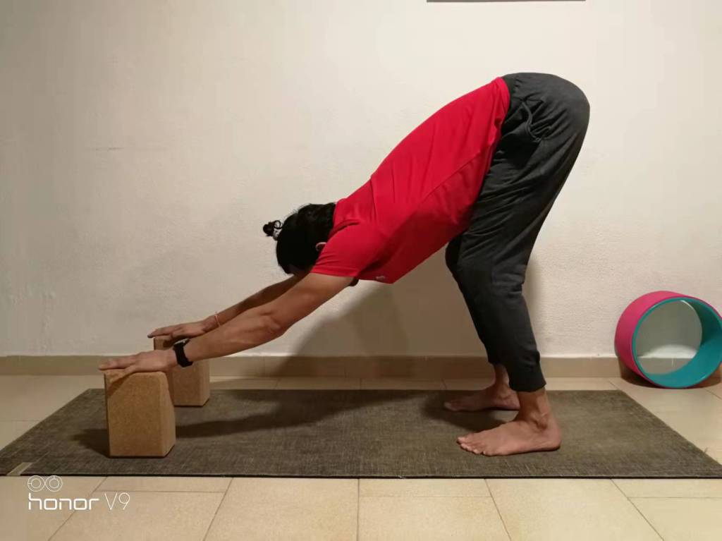 If you still feel pain in your shoulders, you can shift your weight even further on your feet with the aid of blocks: