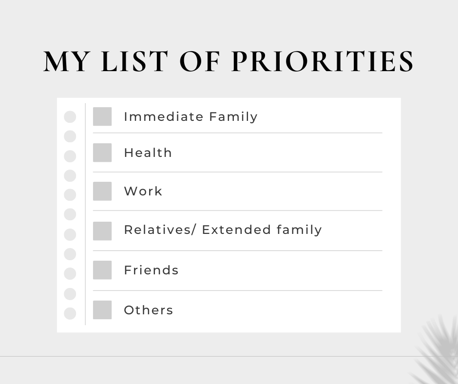 We all hold different things close to heart. However are we actually DOING what we keep in our MIND? Make a list so that you can SEE what you have in MIND. We might say we put family before work, but when there is a family dinner, are we able to say NO to work? When we say we prioritize OURSELVES and HEALTH, are we able to say NO to everything else that is of lower priority? Your priority list is yours to keep, it can stay your secret, but whether you materialize your priority list is also YOUR decision.